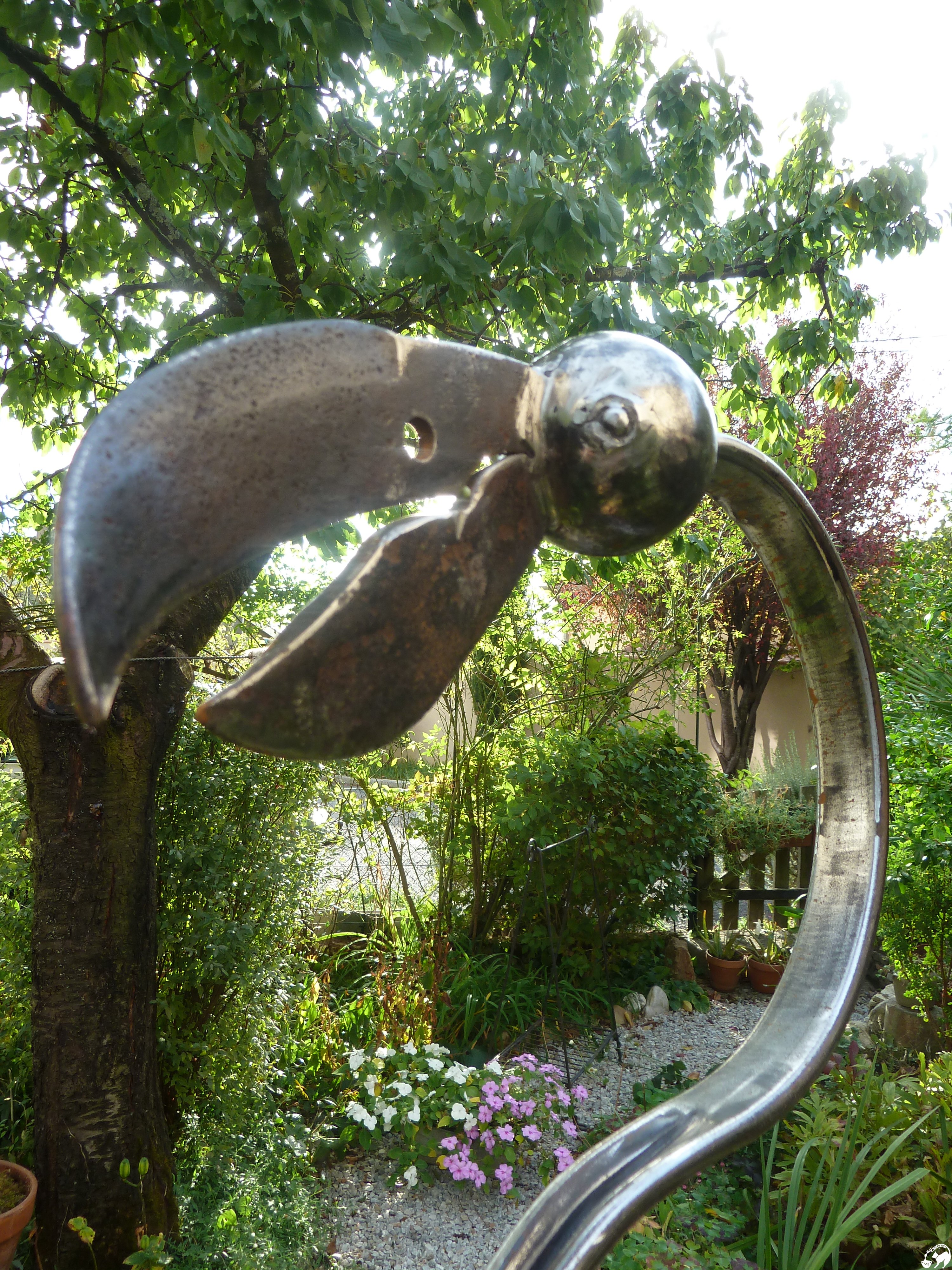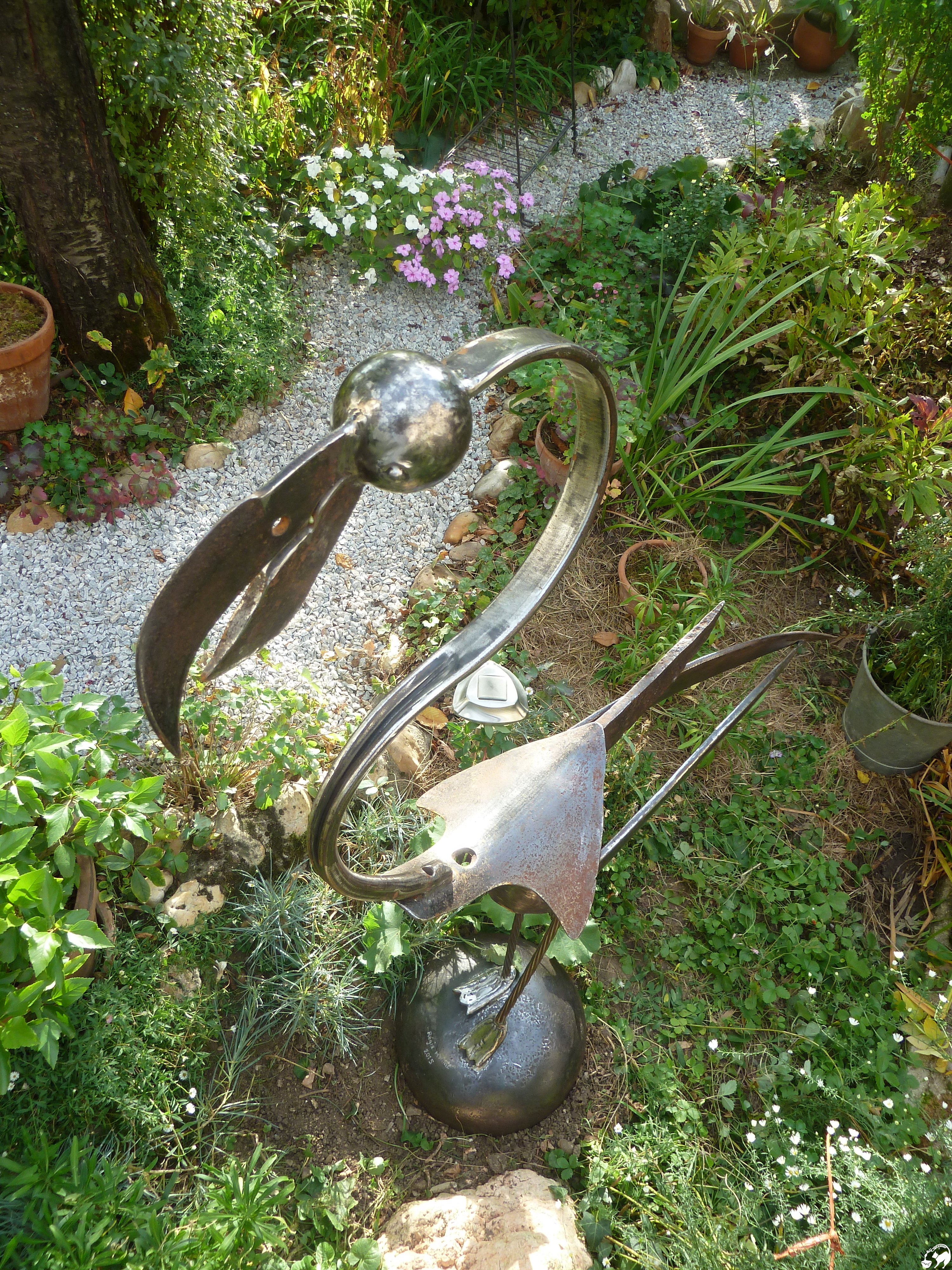 L’âme et la dextérité de l’artiste et voici un échassier de métal, qui dans le jardin va prendre dans quelques jours la couleur de la rouille…